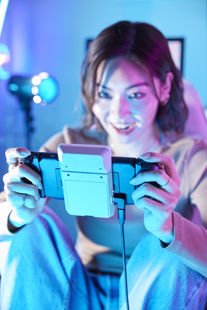 Nintendo SwitchやPimax Portal用ポータブルゲーミングスピーカーのランディングページ。装着するだけでクリアな音、サラウンド感、臨場感を味わえ、ユーザーがゲームの中に没入できる「体験」を軸にデザイン。写真はターゲットであるゲーマーに興味を持ってもらえるようにネオンカラーのライティングで撮影しました。